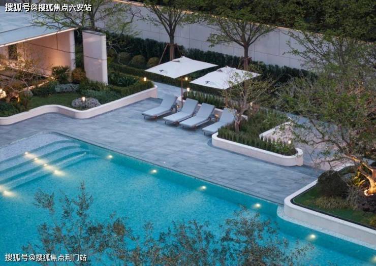 不同于我们常见的拼花戏水池或泳池,望宸映澜水池底部和两侧全部采用意大利进口的天然白色大理石——卡拉卡白进行加工定制铺贴,经过池水的折射呈现出整体淡蓝的度假感。