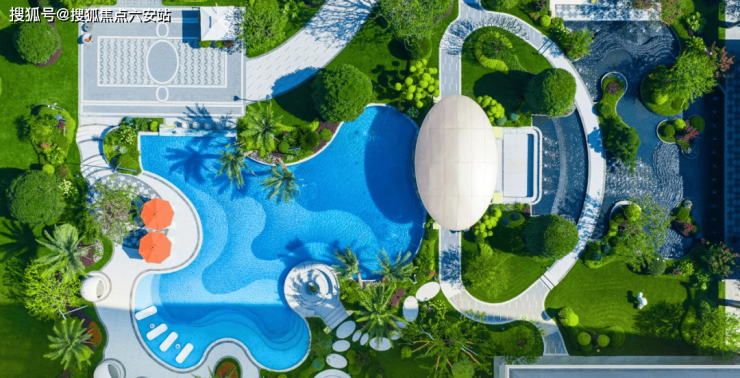 穿门而入,是一方流动的绿洲,叠翠流瀑、悬浮步道,将归家的体验拉满。约300㎡的无限繁星美池,嵌入下沉式水中浮屿,搭配名贵亚热带风情花木,营造浓郁的度假气息。