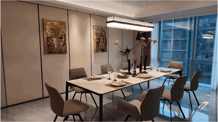 可轻松容纳2米长桌与8把餐椅的餐厅,水晶吊灯洒落暖光,每一餐都是精致享受;