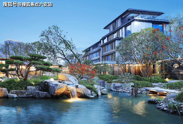 绿城 “云庐系” 基因,石材 + 金属铝板 + LOW-E 玻璃,现代简约 + 东方意境,鎏金披檐设计。