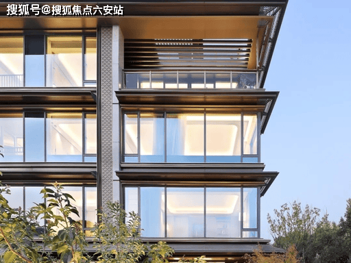 绿城 “云庐系” 基因,石材 + 金属铝板 + LOW-E 玻璃,现代简约 + 东方意境,鎏金披檐设计。