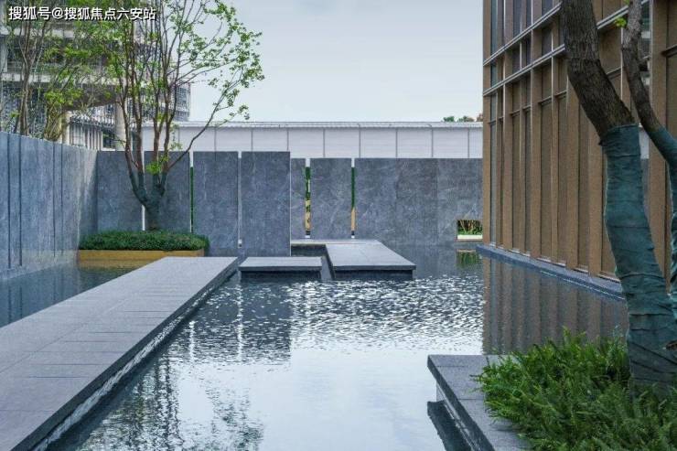 简洁明朗的园路,漂浮穿行于水面,步道间精心点缀几颗景石、漂浮树池及悬挑跌水,无意间演绎了具有现代气质的西湖写意。建筑立面肌理在景观平面上延伸,模块化的条状灌木与砾石带、水景交相错落。强烈的几何构图体现一种秩序与规则之美,灵巧的错位布置又不失活泼,与外围的绿色草坪形成对比。