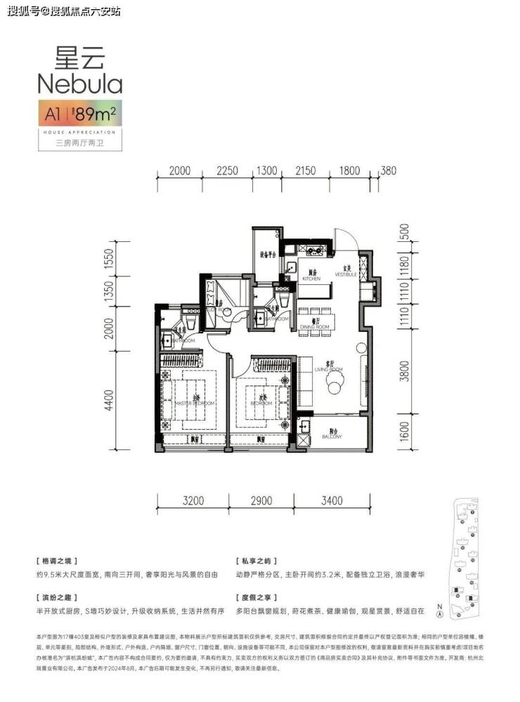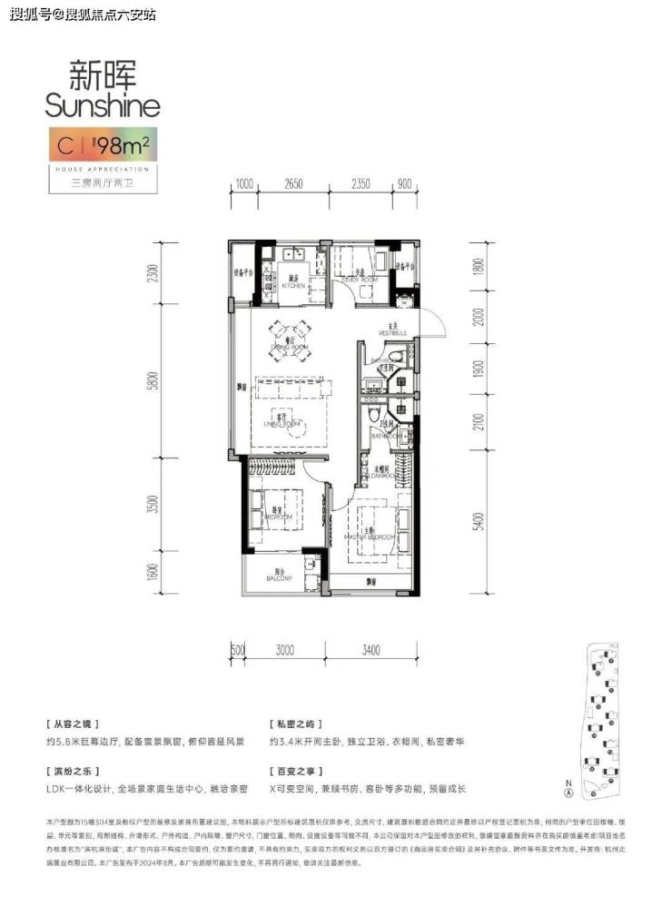 带独立玄关收纳,南边套房主卧带走入式衣帽间+独立卫浴+飘窗,南向约6.4米面宽,带阳台,U型厨房带大开窗,餐客厅一体带约5.8米超长飘窗……该户型更具有生命力。