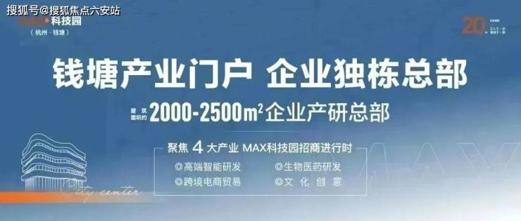 MAX科技园立足钱塘区,以“高端智能研发、生物医药研发、跨境电商贸易、文化创意”四大产业为招商方向,与钱塘区高端产业布局与发展方向同频共振,聚焦高新技术领域,锚定前沿科技,借钱塘区产业转型升级之势,建设面向世界的500强产研总部基地,邀时代企业家,共享辉煌钱塘新时代!