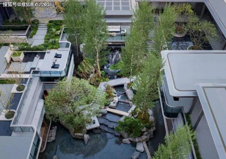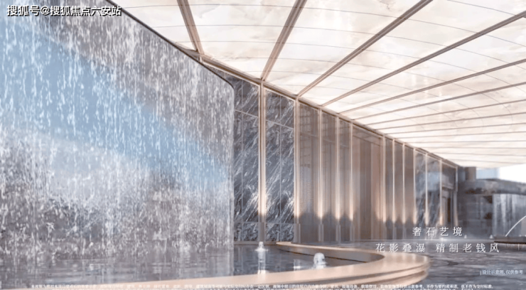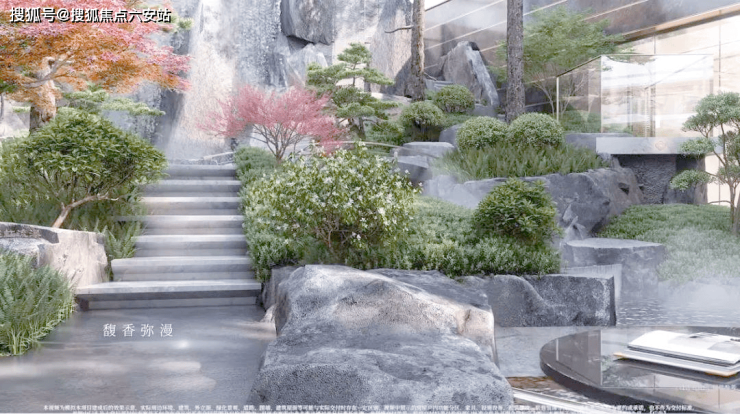 绿城·馥香园的山水庭院设计,巧妙融合了山、水、石、树等元素,呈现出一种独特的视觉美感,仿佛将人们带入了一幅生动的青绿山水画卷之中。其中,流水跌瀑的设计尤为引人注目,老皮石模拟的天然崖壁与山石错落叠放,水瀑落下时飞珠溅起,营造出一种“断山疑画障,悬溜泻鸣琴”的诗意氛围。