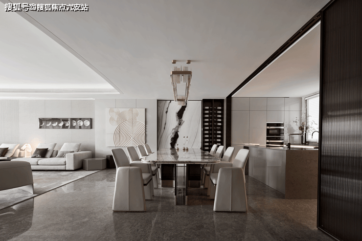 餐厅 厨房与楼梯间,设立了开放的中岛台,形成视觉隔断,在增添功能性的同时,也流露出设计师严谨的美学思考,以及对空间节奏的把控!沿梯下行楼梯利用灯光,呈现出轻盈的悬浮感,夹层作为阅读空间延续了整体色调,在黑白之中求得平衡 不张扬 也不喧闹,弧形沙发和圆形茶几带来的包围感!🔻售楼热线:☎ 400 832 8823「售楼处」☎〢网上售楼中心〢🔻