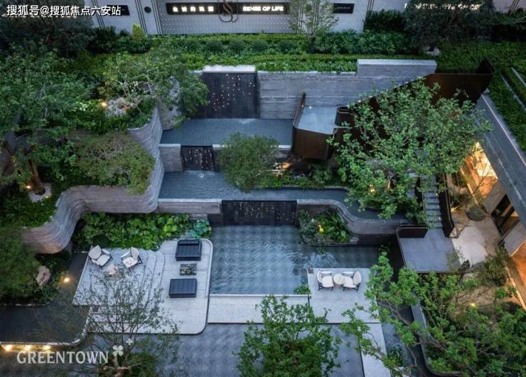 “层林叠院”解构弗兰克·劳埃德·赖特“流水别墅”精髓,三阶跌水倾泻而下。台地花园有序排布,红枫、斜飘紫薇等绿植营造四季景致。阶梯步道、休憩空间巧妙设置,景随人移,随自然渐入沉浸。