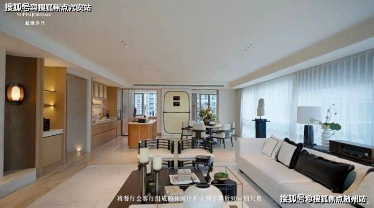 整个餐客厅面积超过75㎡,由曲面落地玻璃门窗围合,外面就是凌空于中央庭院之上的浮岛式阳台。