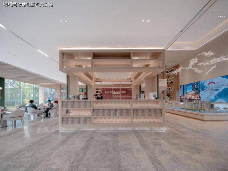 ▲挑空沙盘区的白色沙盘、大理石地面与木饰面格栅三种材质相辅相成,材质间的相互穿插,使得整个空间丰富而灵动。