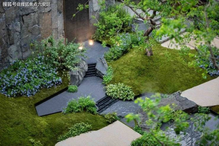 会所入口还采用了和观雲钱塘同款的柏坡黄石材打造迎宾景观,与罗汉松互相映衬。进入示范区后,古朴雅致的下沉式庭院便豁然眼前。昂贵的黑松和羽毛枫分立两侧,四角是设计师精挑细选的乌桕树,中间叠水曲折辗转,宛若自然秘境。