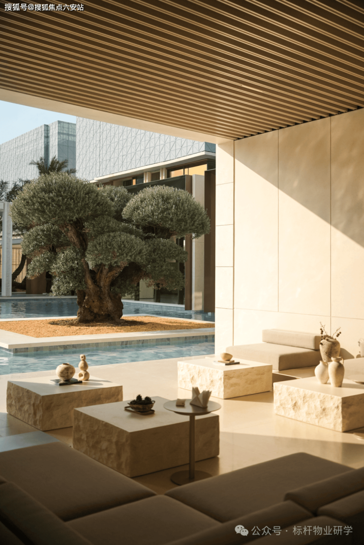 作为首个度假风情的住区,璟逸汲取希腊安缦酒店与Gundari度假村的精髓。素雅的米白石壁墙引领访客,穿行于水院与连廊之间,步入白色莱姆石建筑群,冰蓝水面与沙生植物交织的闲适景致,仿佛将圣托里尼的暖阳拥入怀中。入口处显眼的“矮大紧”树种,介绍说是有上千年树龄的油橄榄,这类树种单棵价格起码有250万,相当的豪气。