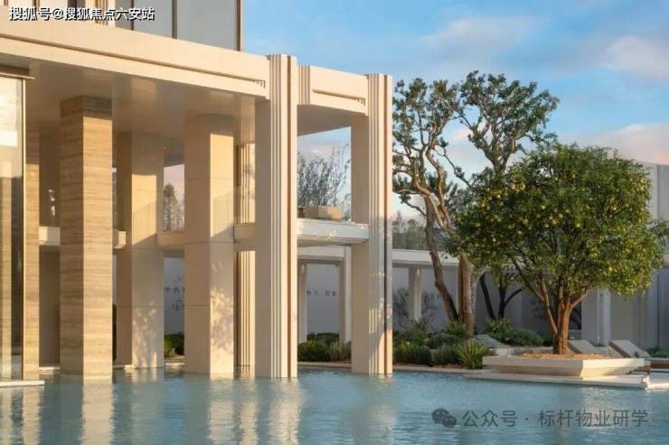璟逸示范区的建筑造型简约而不失格调,灵感源自古希腊神庙。米白色的莱姆石与超大玻璃相得益彰,阳光下泛起珍珠母贝般的光泽,触感温润。材质与光影的和谐对话,赋予建筑纯净的质感,同时不失现代气息。示范区以冰蓝水面为核心,莱姆石铺就地面,老桩油橄榄与银海枣随风摇曳,迷迭香、罗勒与薰衣草的芬芳悄然弥漫,营造出一片宁静雅致的天地。