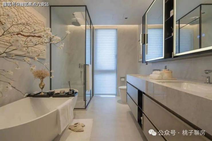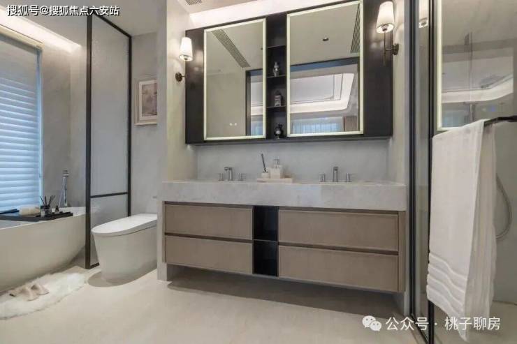 大金的中央空调、新风地暖;厨房用的是嘉格纳的4件套(2台冰箱、蒸烤箱、洗碗机),以及博世的吸油烟机和灶具;卫浴选用唯宝、高仪、汉斯格雅等国际品牌,所有卫生间都配了智能马桶,主卫还配了美妆冰箱