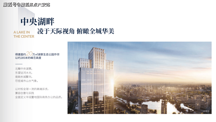 空中大堂:跃 38 高层,于峰峦之上,一揽城市繁华胜景,中央湖景风光,创领商务新风范。