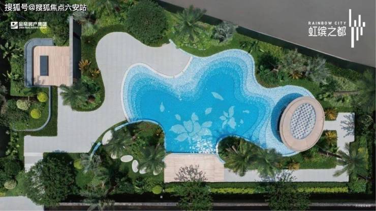已经实景呈现的蒂芙尼蓝中心戏水池,水池边一道道弧形曲线,池底精致的马赛克拼花,透着满满的热带度假风,在配上水池旁挺拔的银海枣等热带植物,未来业主们往水池边一趟,仿佛就置身在东南亚的海滩边的高级度假酒店。