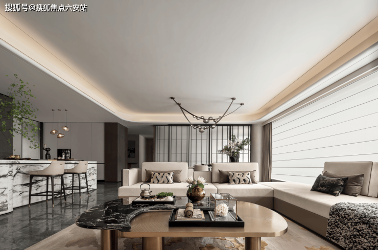 私密空间则由一道移门进行分隔,移门把手采用中式传统的敲铜工艺,每一条复杂的纹路与凹凸,均由纯手工反复镪打而成。尽管只是点滴细节,也起到了强化新中式内核的大作用。