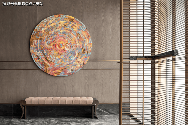 步入玄关处,以一整面森林绿大理石背景墙做视觉隔断,搭配两侧艺术造型的皮革硬包,观感上既没有大面木质隔断的厚重,又不失新中式应有的华丽。当然,木材在新中式产品打造过程中依旧不可或缺,因此缦云仍在玄关处打造了大量木饰面,并采用海棠花腰线设计来提升饰面美感。