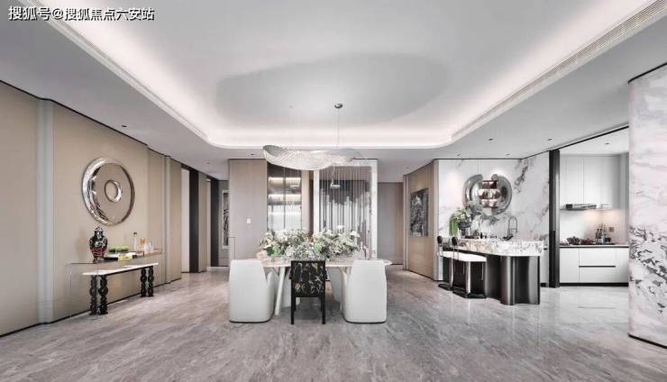 从绿翡翠、芬迪白大理石到艺术玻璃与金属线条融合,带给空间柔和的包裹感,创造高级且浪漫的氛围。