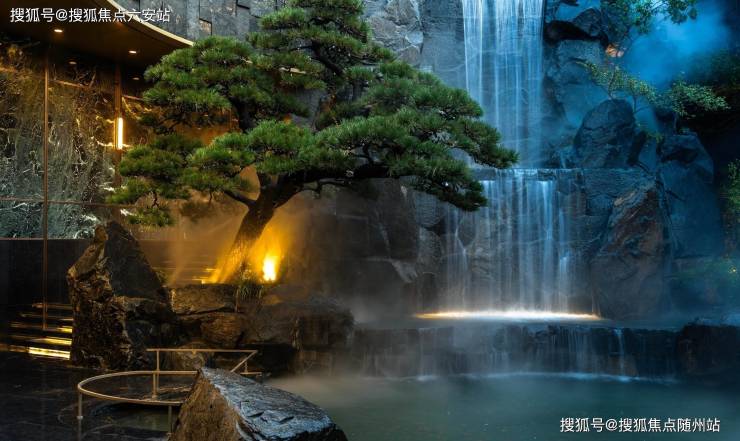 入口以8.2万颗水晶与4.3万片金箔手工缀合打造艺术雕塑,配合600吨中国黑原石堆砌的7米飞瀑、全冠移植百年黑松,构建归家仪式的艺术性。