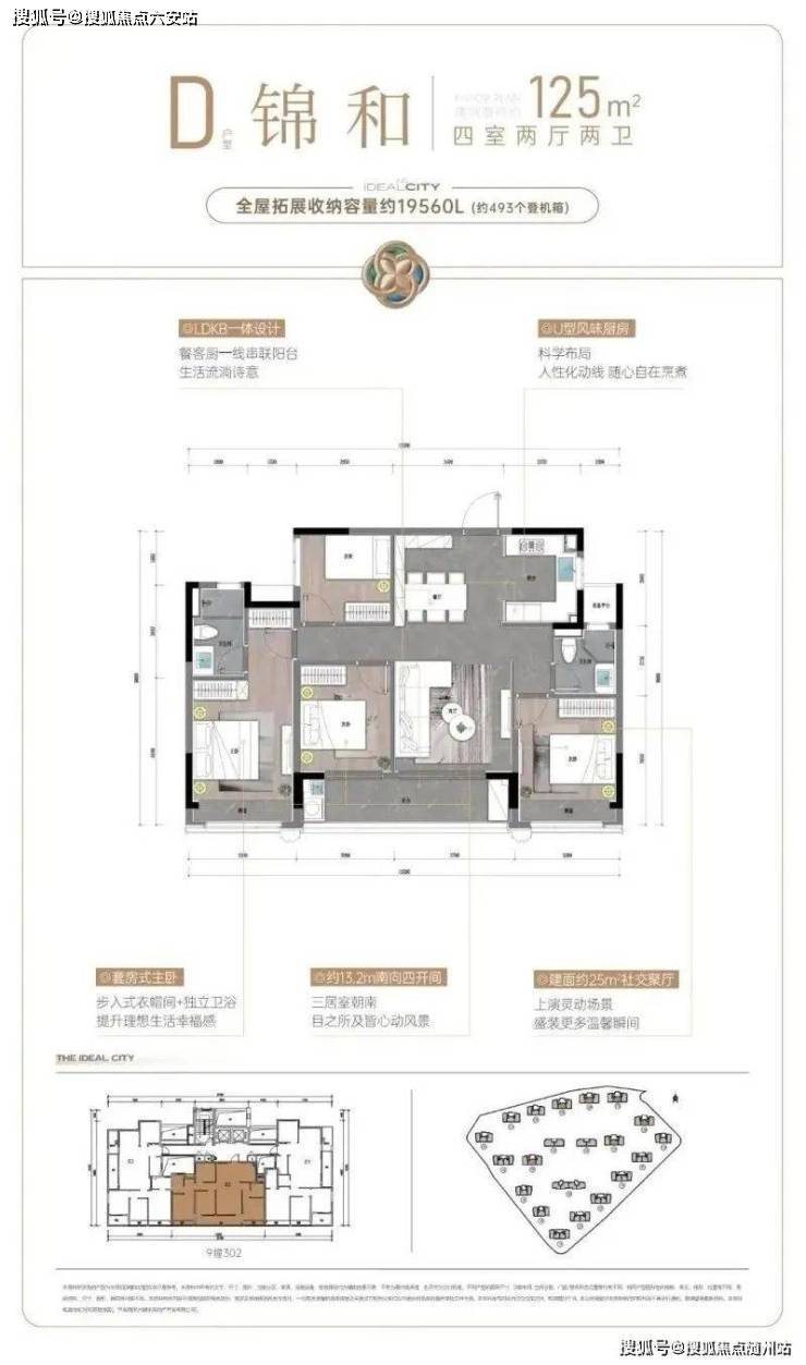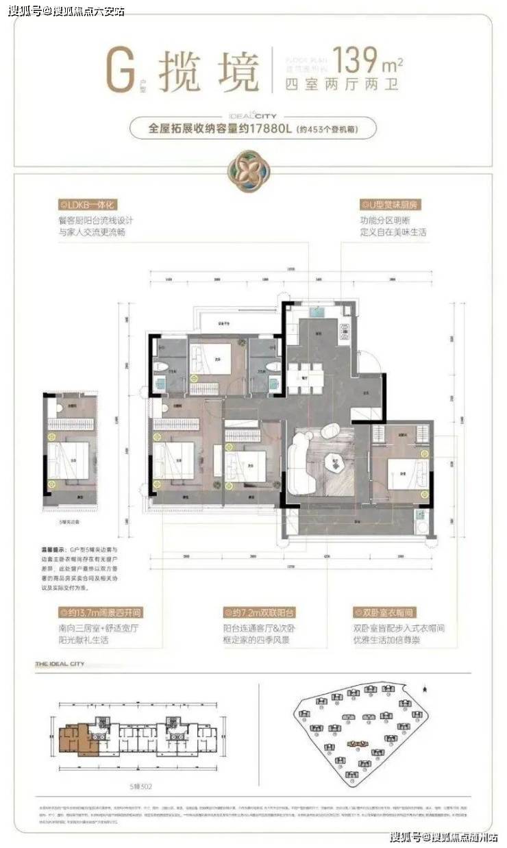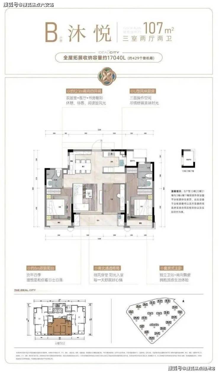建面约107㎡户型,则把重点放在舒适度上。阔绰方厅+双联阳台,通风赏景至佳,还有U型厨房,三面操作空间,动线流畅好用;套房式主卧更配置了步入式衣帽间,独立卫浴设计,保证了主人家的隐私和仪式感。
