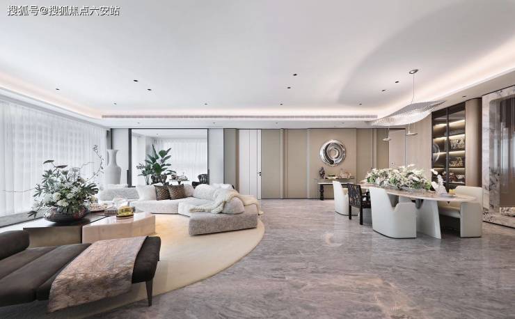 主力实体样板房,335㎡的户型,足以满足二孩甚至三孩家庭的“三代同堂”。3梯两户,拥有独立的家政电梯,保障了主人居住的私密性。客厅都是270度的采光面,⽤餐区都能放下⼀张可容纳8⼈的⼤圆桌。东边套户型拥有一个(建⾯)近90㎡的超⼤公区,南向带有一个(建⾯约)15㎡的空中花园,匹配了一大扇可开启的电动玻璃窗。