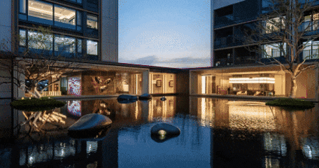比如,是拒绝千篇一律的庭院美学,是漂浮水院,抑或者是温润的木纹铝板立面,海派公区入户大堂。