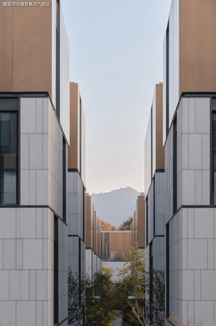 立面采用墙体与开窗错落对位的方式,确保各层空间的私密性与舒适性,避免视线干扰。挑檐、折板与深窗框景,在建筑表皮上形成一套灵动的观景机制,近瞰西溪、远眺西湖,借景自然,渗透日常。