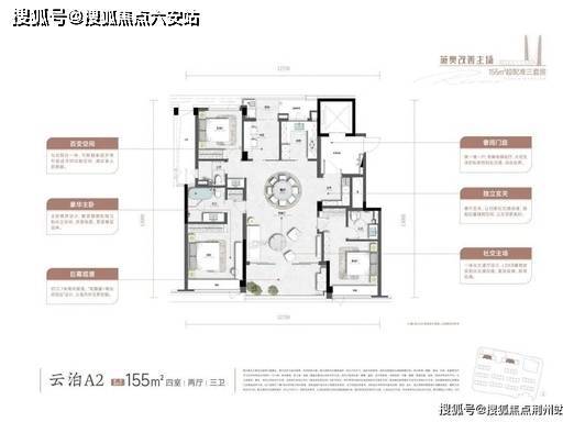 高层(建面约 155㎡):4 室 2 厅 3 卫,类一梯一户私梯入户,南向三开间约 12.7 米面宽,得房率约 90%