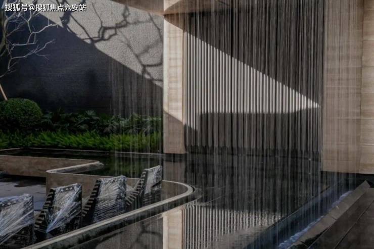 归家大堂以四照亭为引,楼下领要阁、贮月泉衔接泳池、健身房与私宴厅。建筑抬板如“山势”起伏,水幕珠帘飞泻约十米,构成约10米高差山谷碧潭;百年红枫临水而生,与花草相伴,勾勒出“山水入画”的立体诗境。