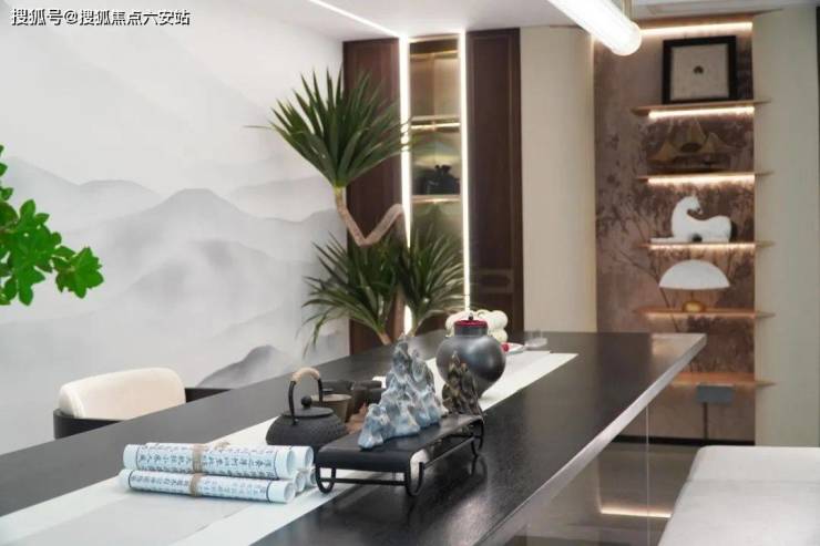 另一侧的现代感工作台,与中式茶室风格不同,却又奇妙地融合在一起。现代简约的设计搭配充足的光线,无论是醉心创作还是处理工作事务,都能沉浸其中。