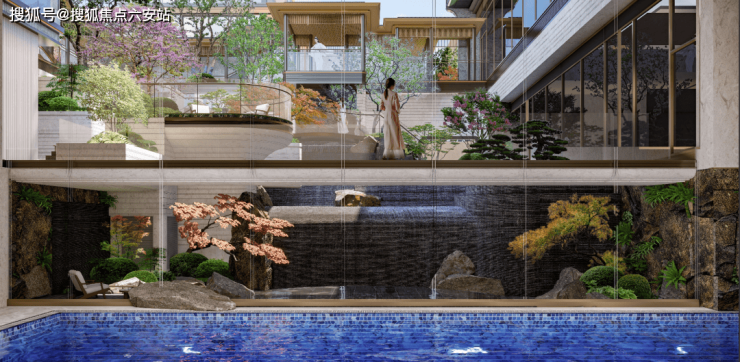 从约6米挑高的恒温泳池望出去,一座廊桥飞架于半空,恰似“人在画中行”。这是只属于云润宸庐的“空中泳廊美学”。中庭大片的薄水池,甚至还一路从室外漫溢到会所室内,堪称奇观。这是杭州豪宅从未有过的“边界消融美学”。
