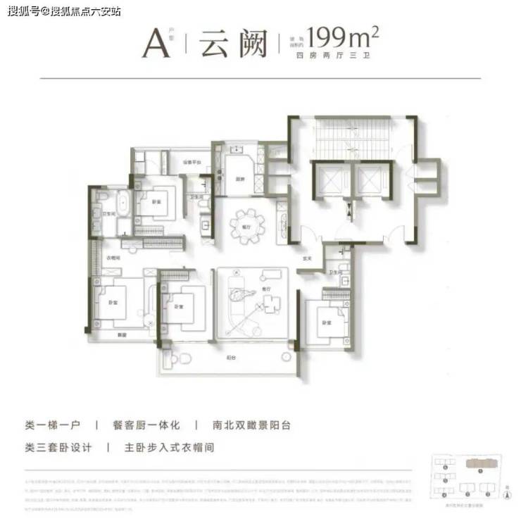 首开(建筑面积约)199㎡A户型,四房两厅三卫设计,拥有豪华双套卧+南北双阳台,甚至每户还赠送储藏室,据说实用率高达92%。