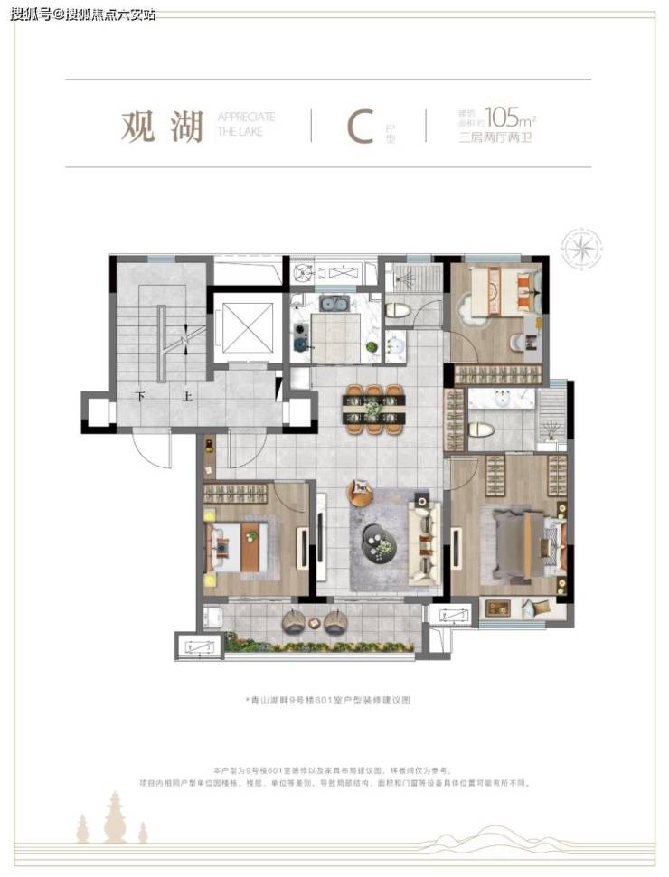 105㎡的三房两厅两卫更适合改善家庭,双联阳台长达6.8米,视野开阔。