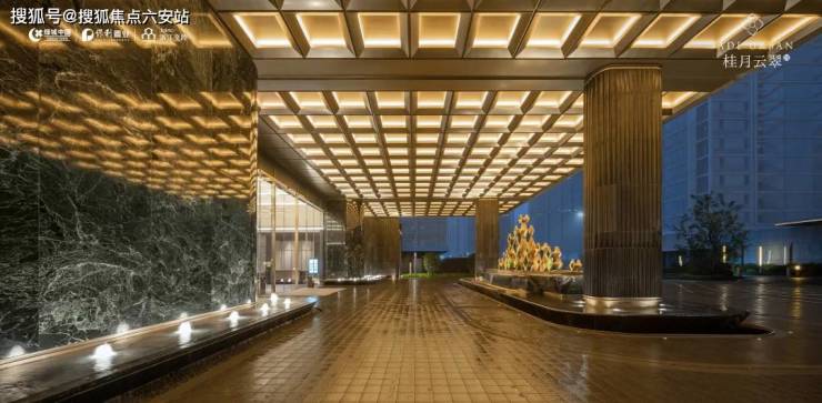 约50m的“翡月之门”,是绿城保利交控·桂月云翠带给人的最初印象。流金穹顶与皇家金檀大理石构画的背景前,一方环岛车行落客区,令五星级酒店式归家成为现实。“明月松间照,清泉石上流。”王维独到的山水观,在下沉式庭院“空翠砯崖”上演。