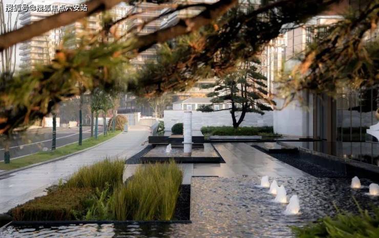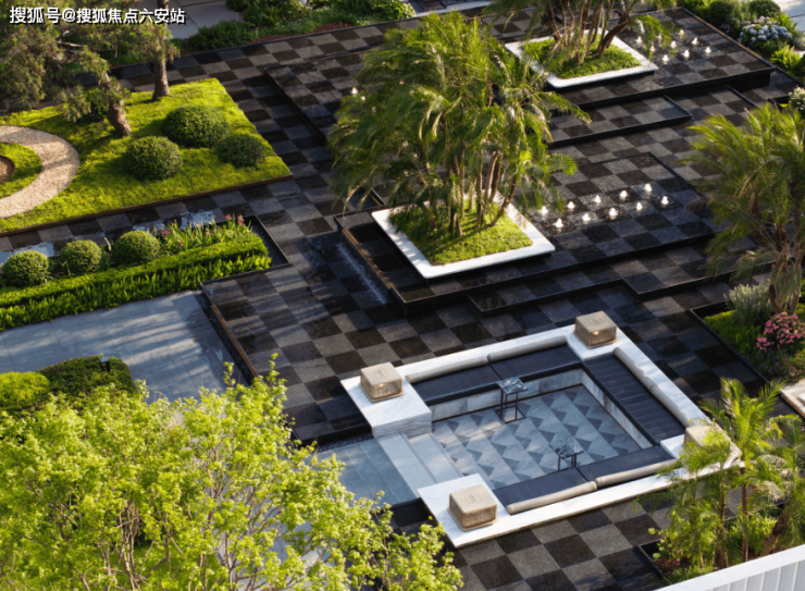 踏入全新示范区实景的那一刻,就被眼前草坡与 虎皮黄石材的搭配所吸引,草坡如同自然岛屿,地砖则犹如流动的水流,这种虚实相生的设计,共同打造出了一片别致的枯山水景致。