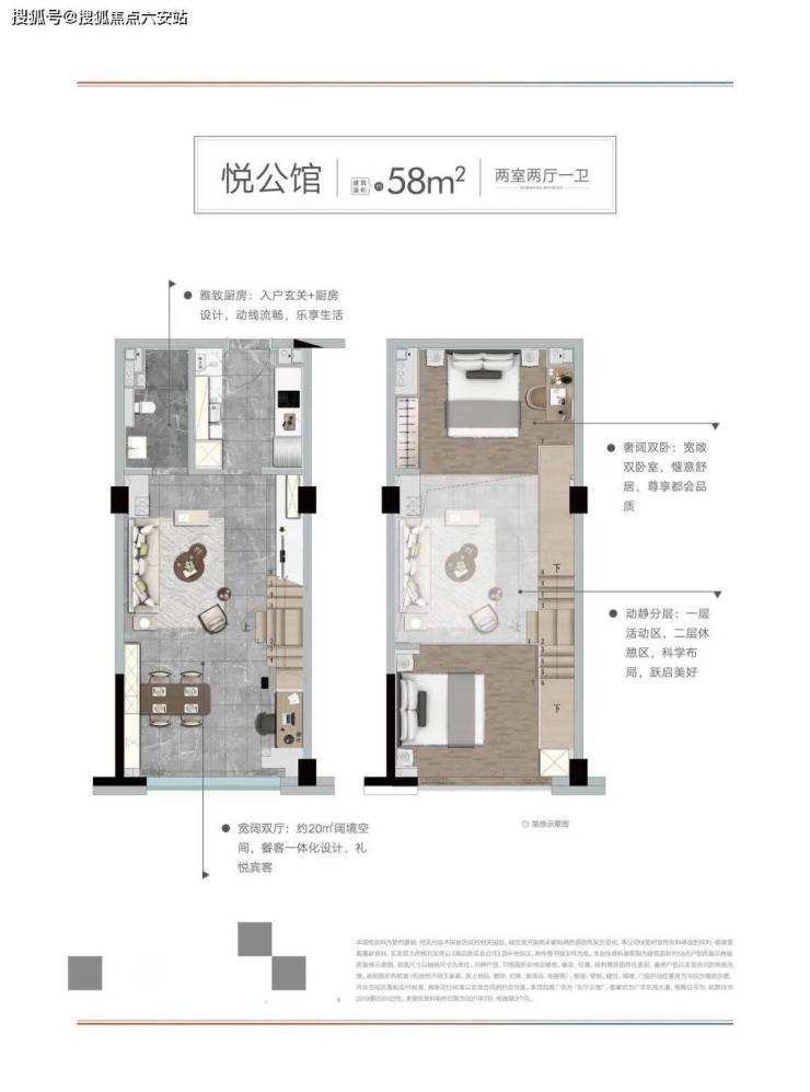 1️⃣ 58㎡单廊平层:百万级总价入住主城芯,餐客一体+独立厨卫,双向采光通风,南向客厅与北向次卧全明通透,推窗见河景,清风常相伴。