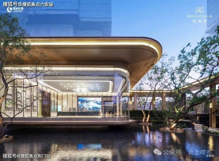 主入口知·云栖,取意西湖十景以"洄游"为理念,超52米跨度的回字形布局,重构传统"四水归堂"空间序列,约2.4米“流光礼宾” 塔冠,如悬浮的美学灯塔,与金色挑檐相映成辉,全封闭式阳台勾勒建筑轮廓,让立面如镜幕般收纳约30公里江岸鎏光!