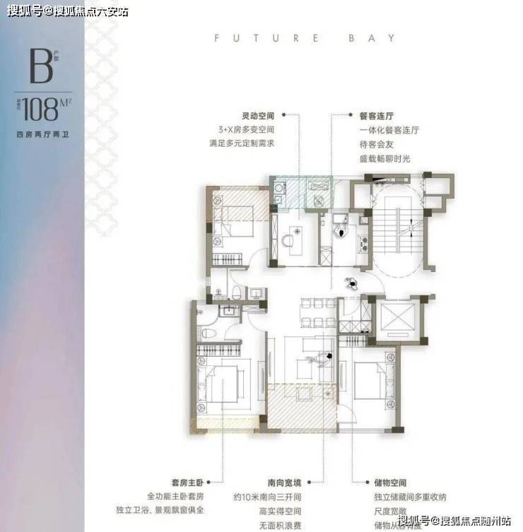 约108㎡的户型则设计了3+X灵动空间,无连廊确保南北通透,采用四叶草布局,卧室分布于四角,互不干扰。