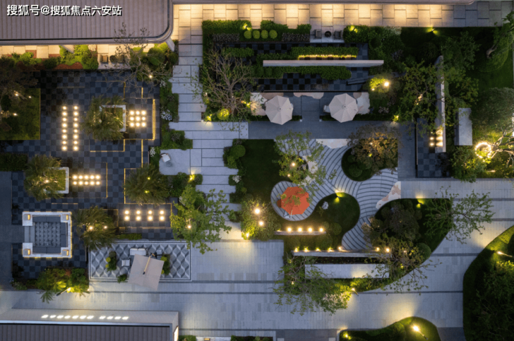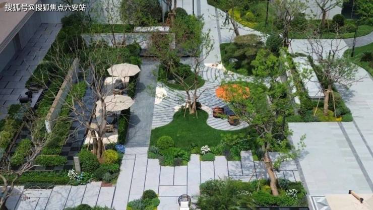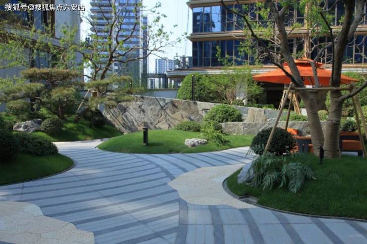 踏入全新示范区实景的那一刻,就被眼前草坡与 虎皮黄石材的搭配所吸引,草坡如同自然岛屿,地砖则犹如流动的水流,这种虚实相生的设计,共同打造出了一片别致的枯山水景致。