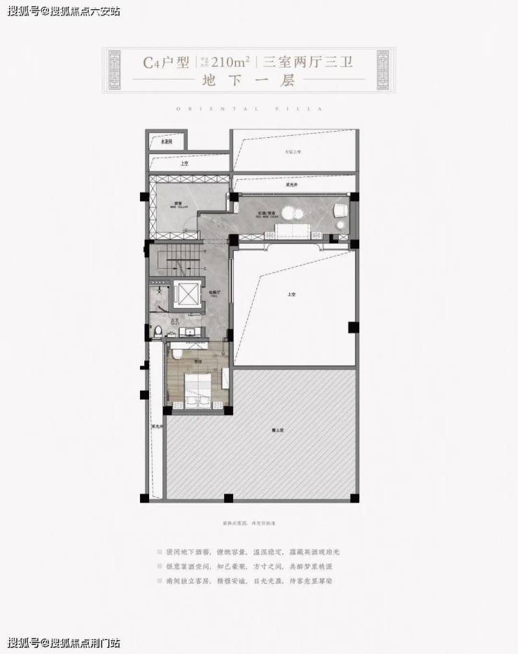 项目最引人注目的,是那批借助高差诞生的“阳光双首层”户型。以建面约330㎡的H户型为例,地下二层的室内可配置保姆房、家政间、影音室、酒窖、棋牌室、品茗区,室外可设置一个园池檐亭的中式庭院。