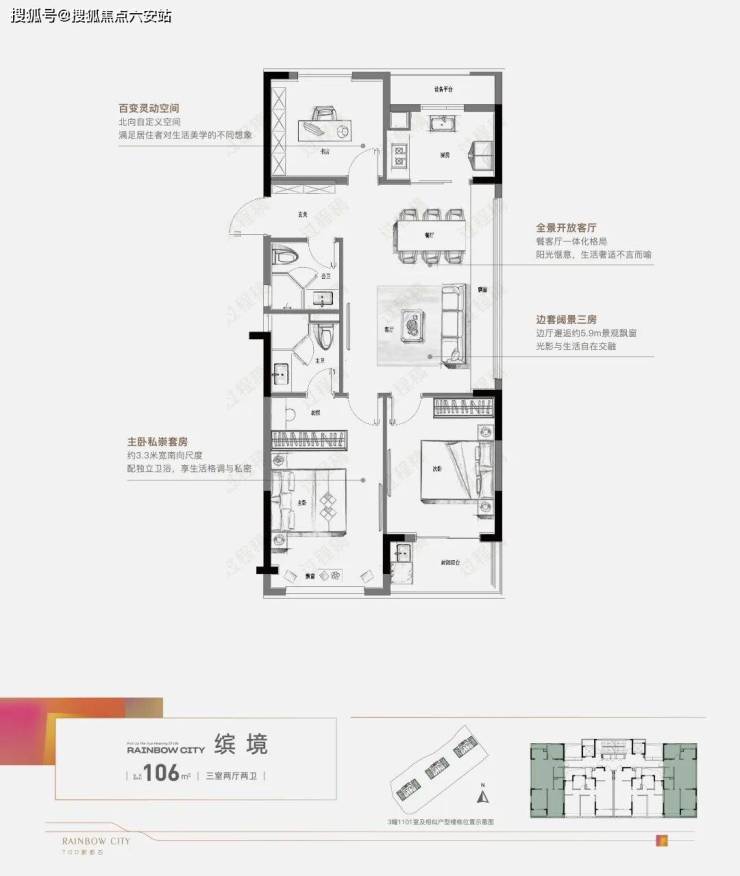 建面约106㎡边套户型,这在同面积段中尤为罕见。户型方正,客餐厅拥有约5.9米长飘窗,推门而入便能感受到极佳的视野与光线,居住舒适度大幅提升。