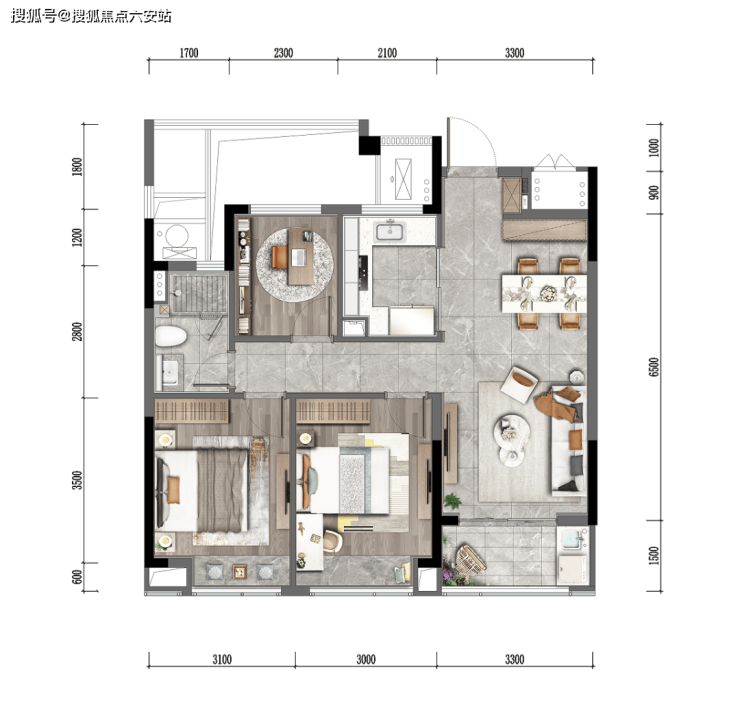 还有我最喜欢的建面约106㎡的“3+1”边套户型 ,可能是未来的爆款户型。因为它在同面积段中尺度感更强 ,进门的客餐厅公区和U型厨房都十分阔绰,约6米的边厅自带飘窗,主卧和次卧两开间朝南是约6.3米长的双联超大阳 台,比一般三房边套视觉更大气,采光更通透。