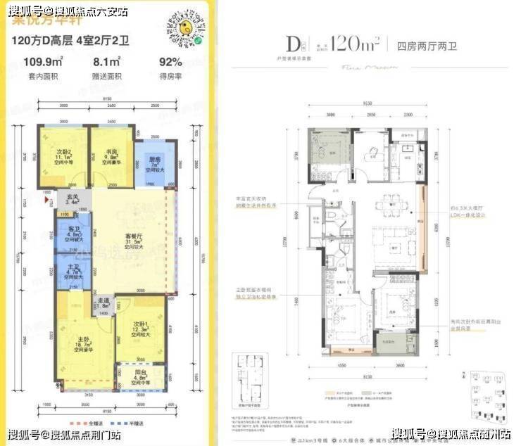 更大一些的户型如建面约120m²的四房边套设计,南向双卧室+客厅大飘窗的设计提升了居住舒适度。