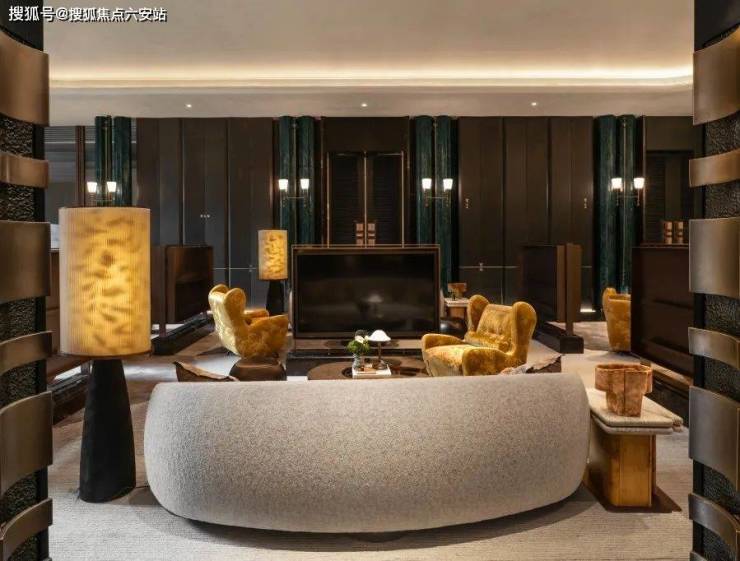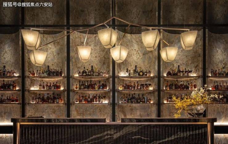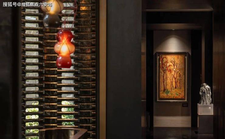 金属骨架层叠交错,复刻出乔司石塘肌理,隐约令我们回望杭州丝织的柔美纹路,层层琥珀色的构件似钱塘潮涌、波光凝固,与墙面如意吉祥纹呼应,藏纳家宅安康祈愿。