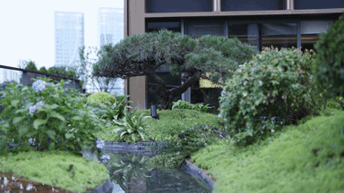 市场罕见的300方的露台花园,借鉴宋画山水,布局坐石临流、林木寻幽、西园雅集、坐拥泉壑的四重场景,构建出一幅流动的山水画卷。