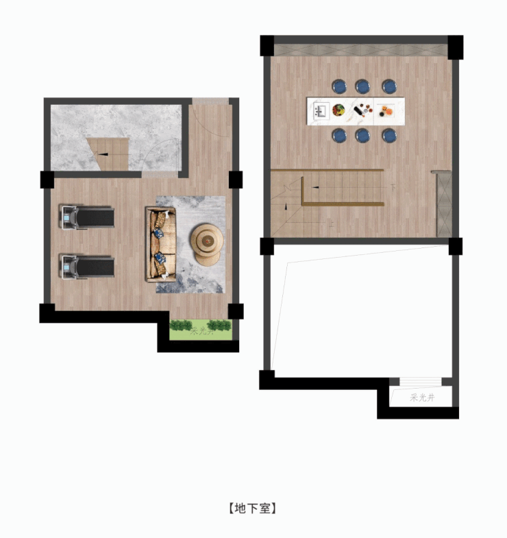 E户型最令人惊讶的,是约5.4m的挑高地下层,这样的挑高会客厅,可随心上下分隔,呈现个性气场。或锻炼健身,或影音休闲,家庭派对、待客会友……百变自由风雅空间,让主人的心情与爱好有处安放。