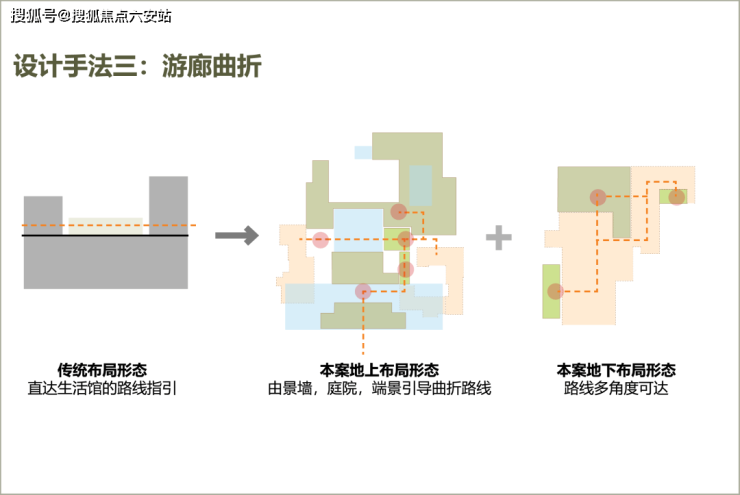 在确保主入口仪式感的同时,重新解构生活馆功能;围绕地上与地下空间流线,分别植入8个主次庭院,以提高景观的可视性;并利用曲折的游廊系统串联分散的空间,形成可望亦可游的庭院空间。通过多点体验的流动奢境,既避免空间压迫感,又实现私密性与开放性的动态平衡。