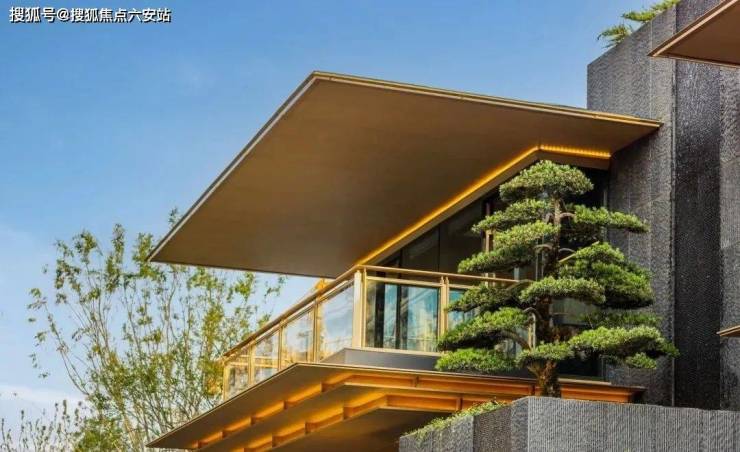 转译形成深远的挑檐,在视觉效果上给人以棱角分明、结构清晰之感,整体呈现一种清雅内敛的当代气质,大尺度巨幕玻璃窗镶嵌金色铝线条,如画框一般,攫住窗外的每一寸风景,让建筑隐于自然。