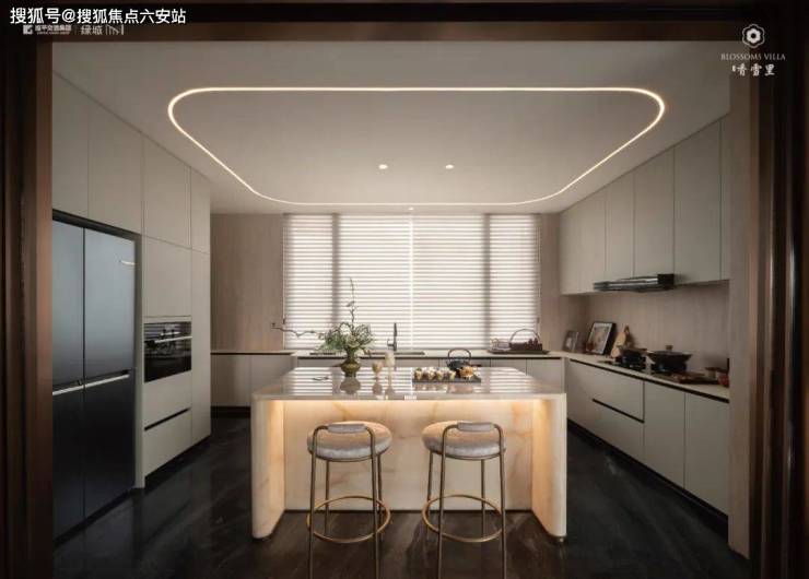 客餐厅 LDKB 一体化设计,古铜夹丝玻璃将厨房化作鎏金屏风,尽显东方美学。