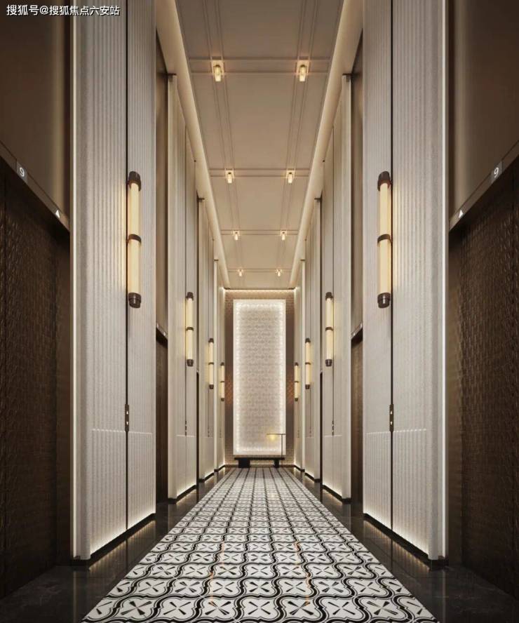 而且从水刀拼花的奢石地面、原石雕琢的墙面,到“亭台楼榭”感的悬浮空间,以及和墙面纹样一致的电梯厅荷叶纹,目光所及,是一种更轻盈的奢感。